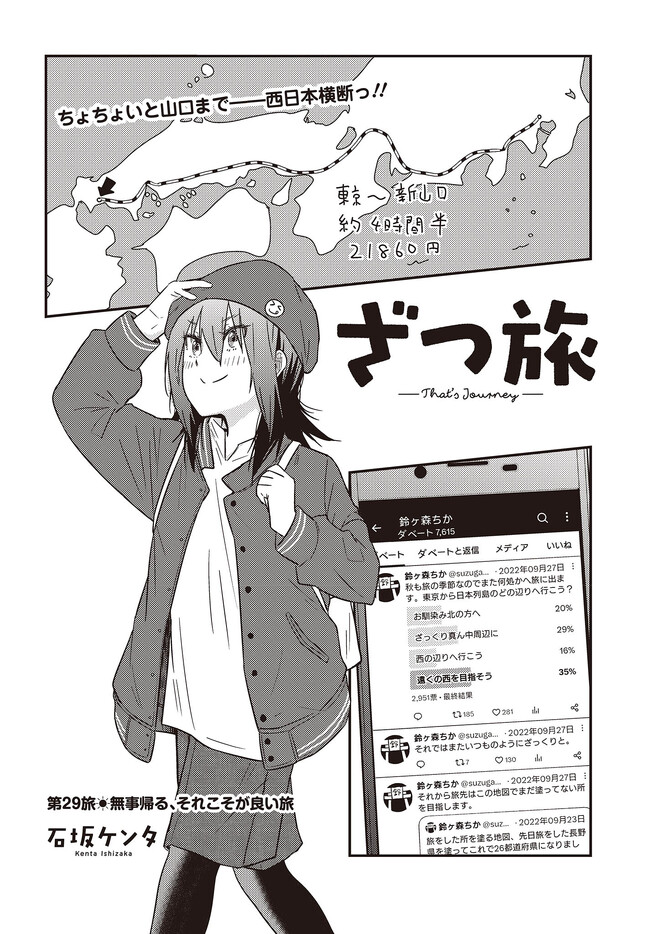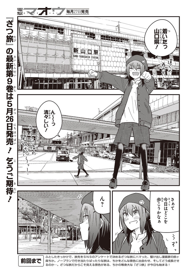 新人漫画家の鈴ヶ森ちかは、ネームを持ち込む度に全ボツを食らっていた。 心が折れかけた彼女だが、唐突に旅に出ることを思い立ち――。 ざつな旅だからこそ癒やされる、究極旅コミック!