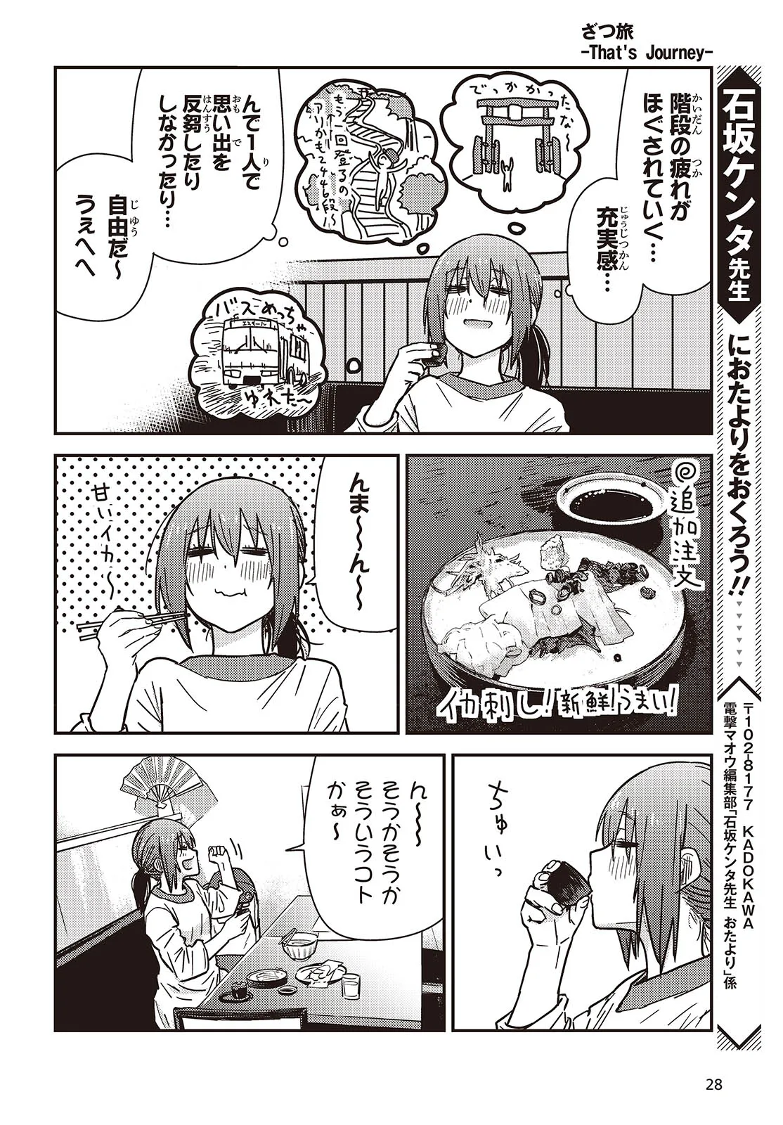 新人漫画家の鈴ヶ森ちかは、ネームを持ち込む度に全ボツを食らっていた。 心が折れかけた彼女だが、唐突に旅に出ることを思い立ち――。 ざつな旅だからこそ癒やされる、究極旅コミック!